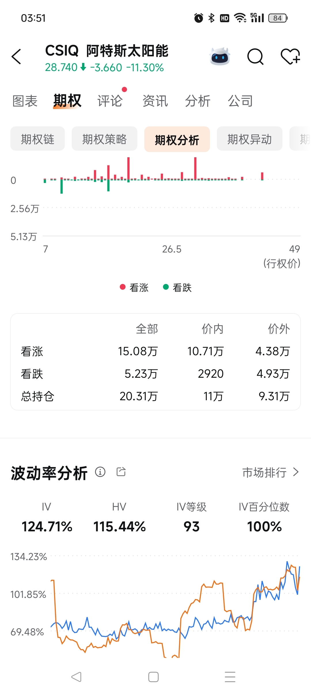 $阿特斯太阳能(NASDAQ|CSIQ)$ 目前看多期权的人大多数还是赚钱的,价内10.71万的数量至少要减少25%这个股走势才会平稳,这是多空盈利的大概平衡。其实做空阿特斯还是不好做的,因为它有换手,价内和价内今晚就有可能平衡,平衡波动率低就没法做,现在平仓,鸡肋没味道。