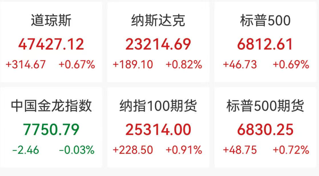 周三(11月26日),美国三大股指全线收涨,道指涨0.67%,标普500指数涨0.69%,纳指涨0.82%。