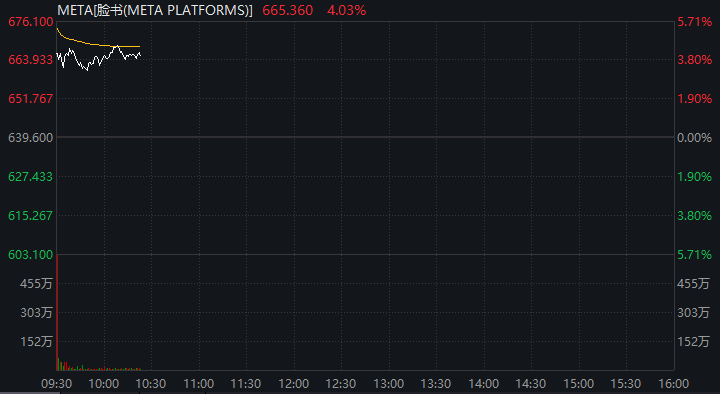 个股方面,Meta盘初一度涨超5%,截至发稿涨幅收窄至4%左右。