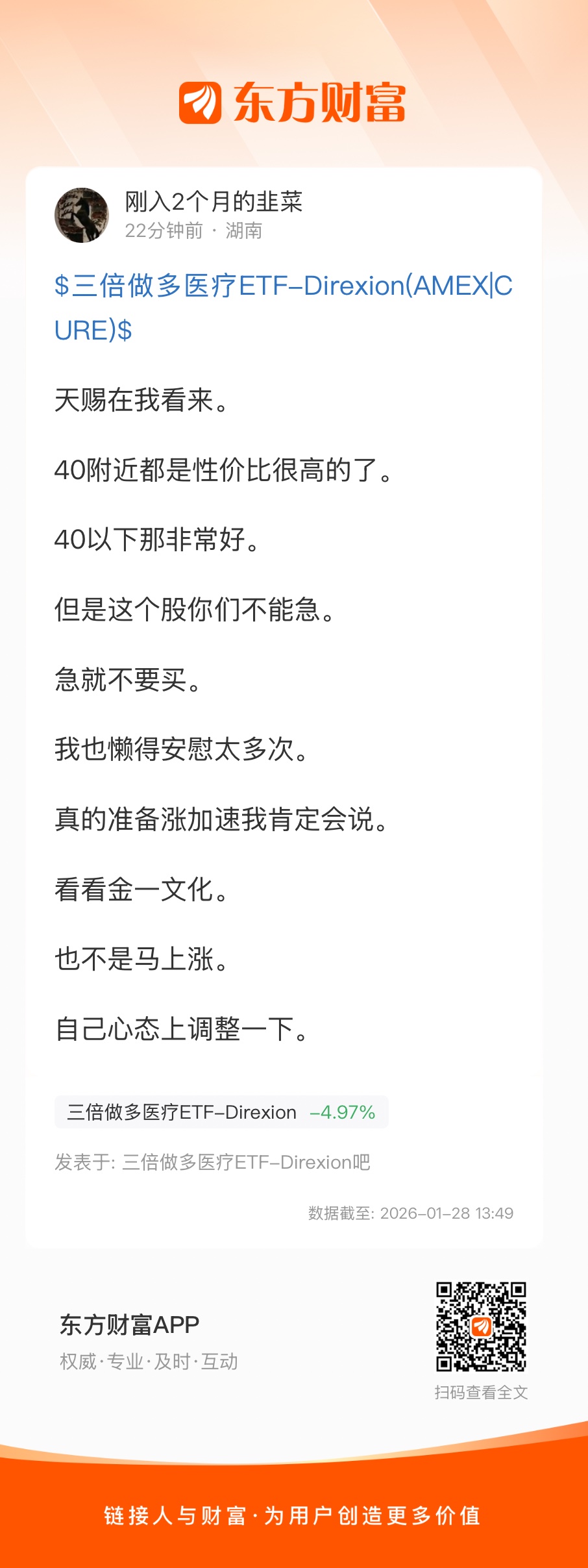 温馨提示: 1.根据《证券法》规定,禁止编造、传播虚假信息或者误导性信息,扰乱证券市场;2.用户在本社区发表的所有资料、言论等仅代表个人观点,与本网站立场无关,不对您构成任何投资建议。用户应基于自己的独立判断,自行决定证券投资并承担相应风险。《东方财富社区管理规定》