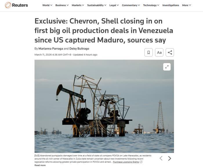 中新网3月11日电在2个月前美国政府对委内瑞拉实施军事打击并强行控制了尼古拉斯·马杜罗总统夫妇后,近日,石油巨头雪佛龙和壳牌公司接近与委内瑞拉达成首批重大石油生产协议。
