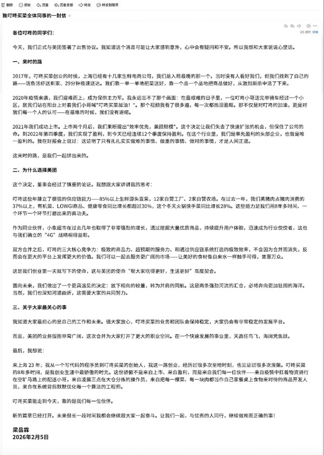 据央广网,针对上述收购事项,叮咚买菜创始人梁昌霖2月5日向全体员工发布内部信称,“放下相向的较量,转为并肩的同行”。