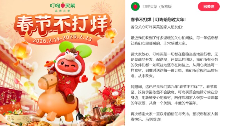 2月9日,叮咚买菜通过官方小红书账号发布信息称:“请大家放心,叮咚买菜一切都在稳稳当当地运行着。无论是商品开发、配送员,还是品控团队,我们所有业务的伙伴们都一如既往地坚守在岗位上。从用心挑选每一样食材,到准时送达每一份订单,我们所珍视的品质标准,从未改变。”