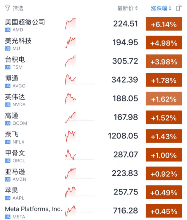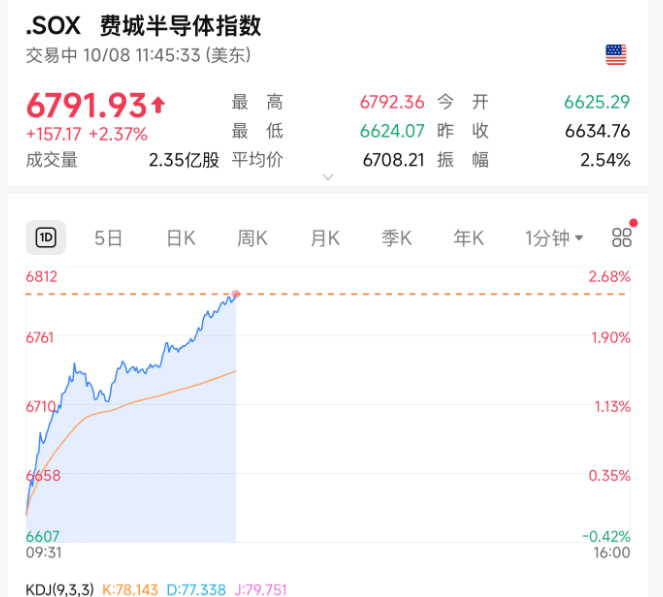 此外,以半导体为主的科技板块集体大涨。费城半导体指数暴涨超2%。