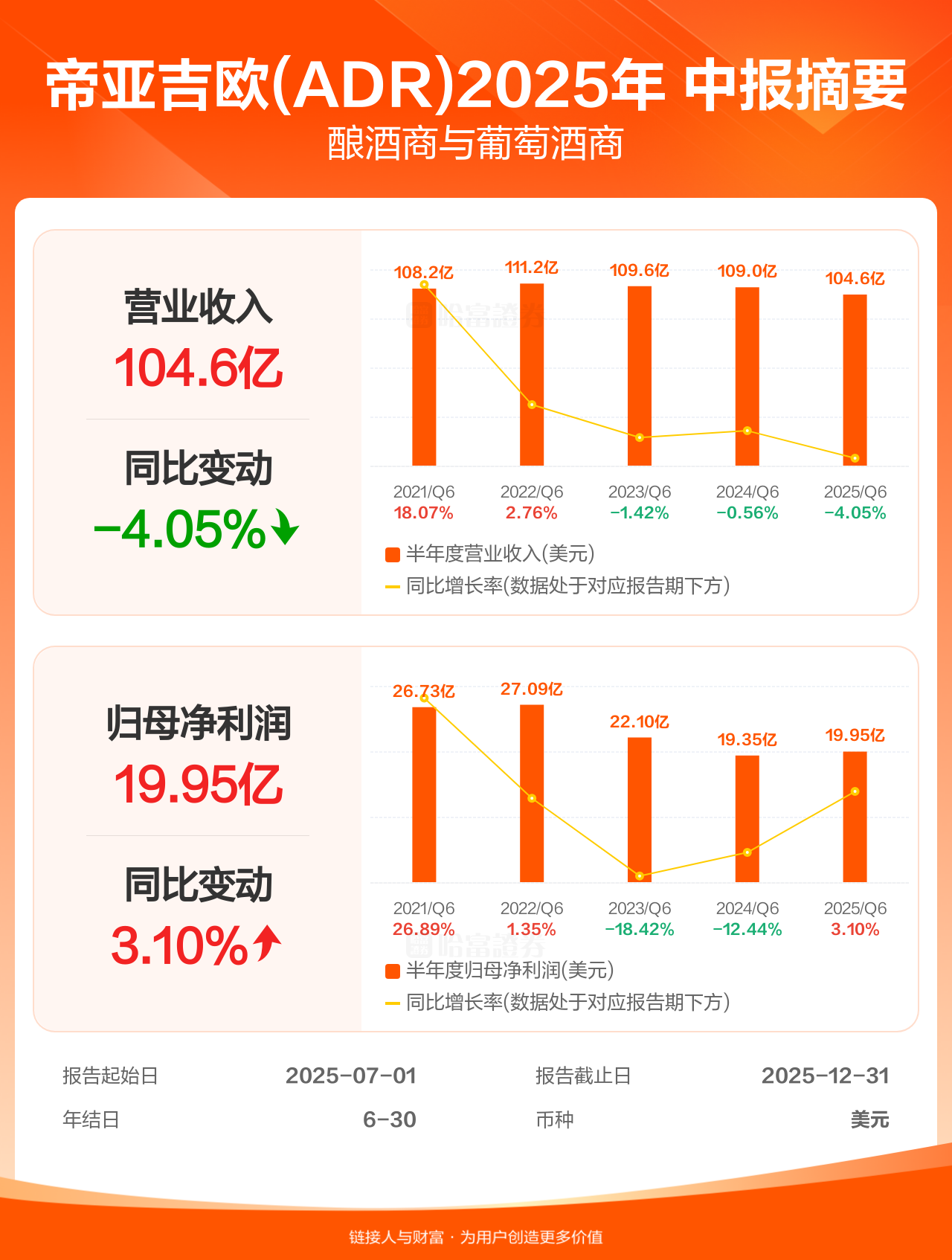 帝亚吉欧(ADR)2月25日发布中期业绩,截至2025年12月31日的6个月内,该公司营业收入104.60亿美元,同比减少4.05%;公司权益持有人应占溢利(归母净利润)19.95亿美元,同比增长3.10%。