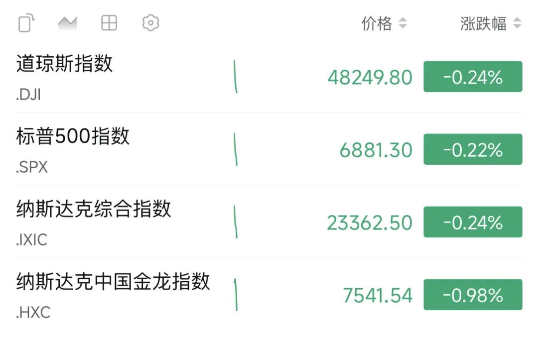 当地时间12月31日(周三),美股三大股指微幅高开,随后全线转跌。截至发稿,道指跌0.24%,标普500指数跌0.22%,纳指跌0.24%。