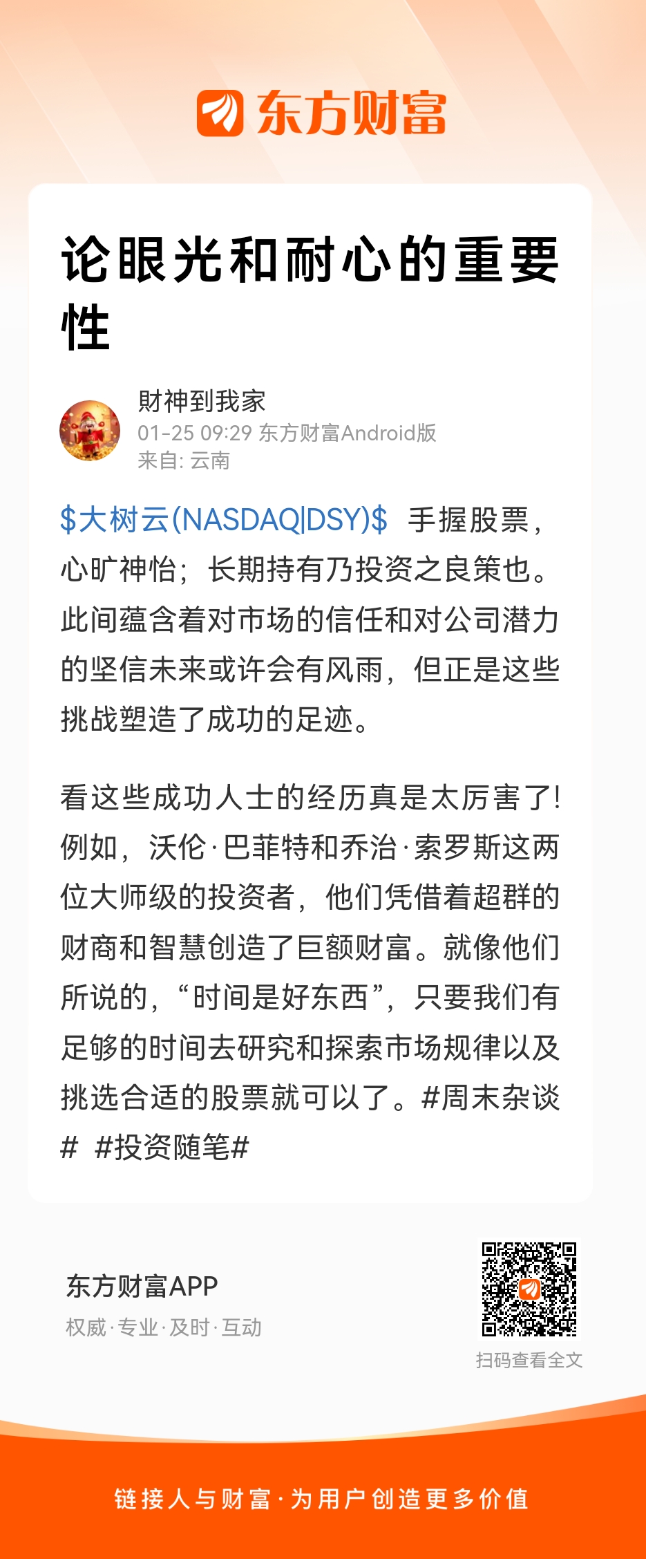 $大树云(NASDAQ|DSY)$ 手握股票,心旷神怡;长期持有乃投资之良策也。此间蕴含着对市场的信任和对公司潜力的坚信未来或许会有风雨,但正是这些挑战塑造了成功的足迹。
