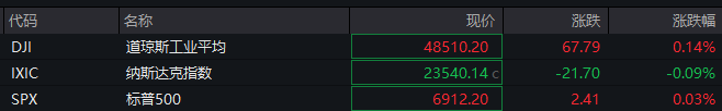 当地时间12月24日,美股三大指数小幅低开,随后走势出现分化,截至发稿,道指涨0.14%,纳指跌0.09%,标普500指数涨0.03%。