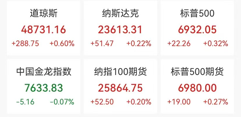 截至收盘,道指涨0.6%报48731.16点,标普500指数涨0.32%报6932.05点,纳指涨0.22%报23613.31点。