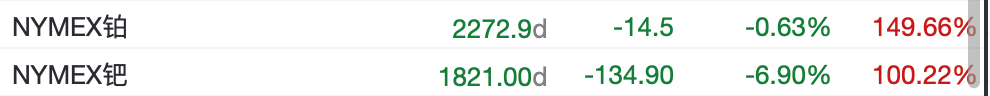 相较之下,近期走势强劲的钯金惨淡收盘,NYMEX钯盘中一度跌破1800美元/盎司,收盘大跌近7%。