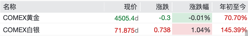 国际贵金属期货涨跌不一,盘中金银短线下挫,收盘COMEX黄金期货跌幅收窄,收报4505.4美元/盎司,COMEX白银期货由跌转涨,重新站上71美元/盎司上方。
