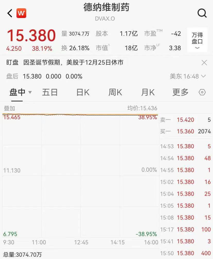 个股方面,德纳维制药股价飙升超38%。消息面上,赛诺菲12月24日发布声明,其同意以约22亿美元的价格收购德纳维制药,旨在扩充其目前以流感疫苗业务为核心的疫苗产品线。