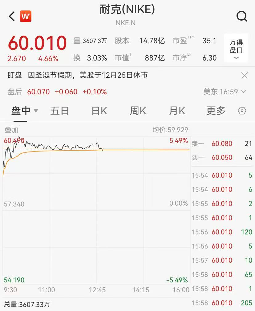 消息面上,据证券时报报道,耐克获苹果CEO库克购入5万股股票。