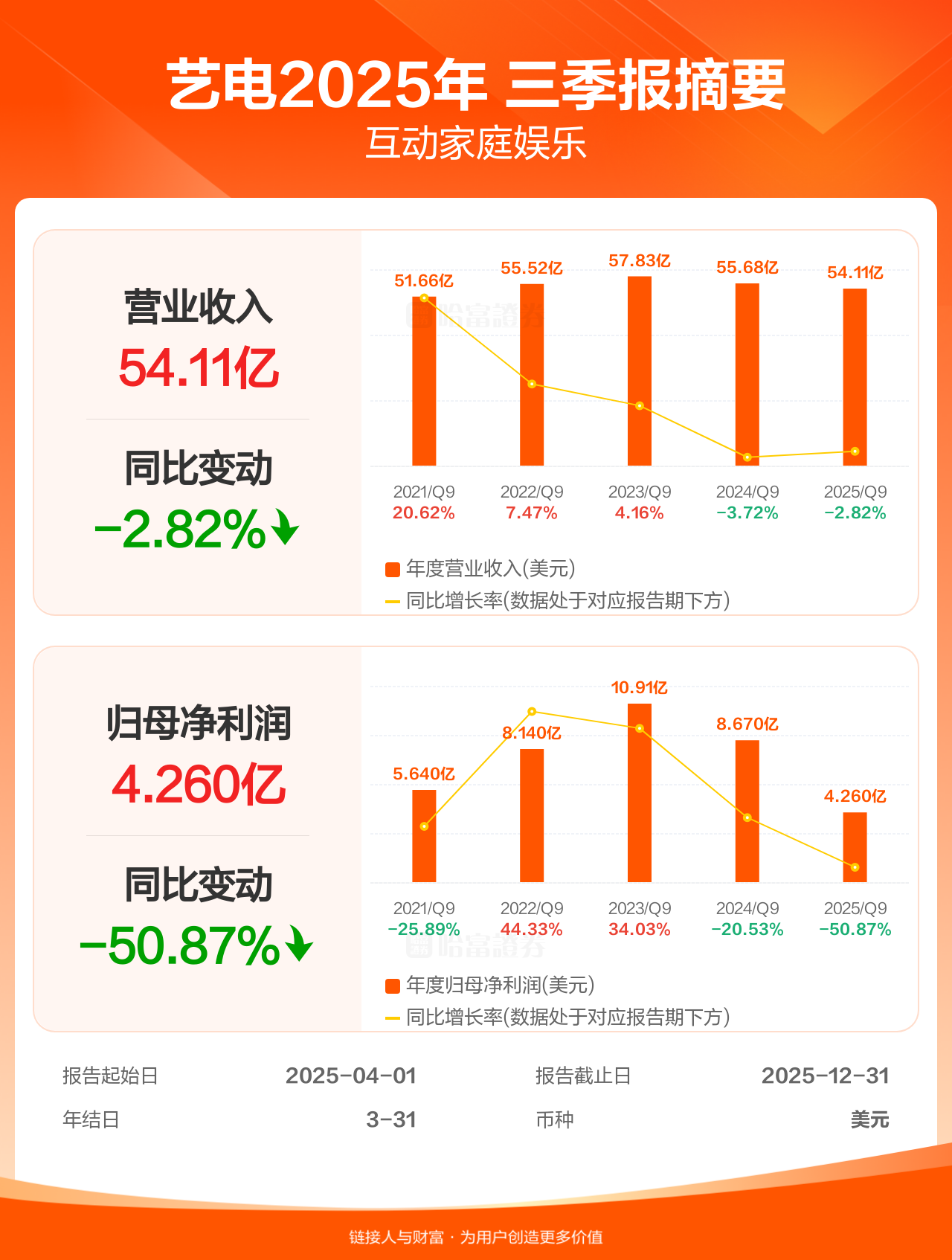 艺电2月3日发布三季报业绩,截至2025年12月31日的9个月内,该公司营业收入54.11亿美元,同比减少2.82%;公司权益持有人应占溢利(归母净利润)4.26亿美元,同比减少50.87%。