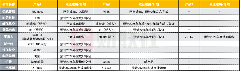 多架eVTOL预计2026年完成TC取证规模化交付在即