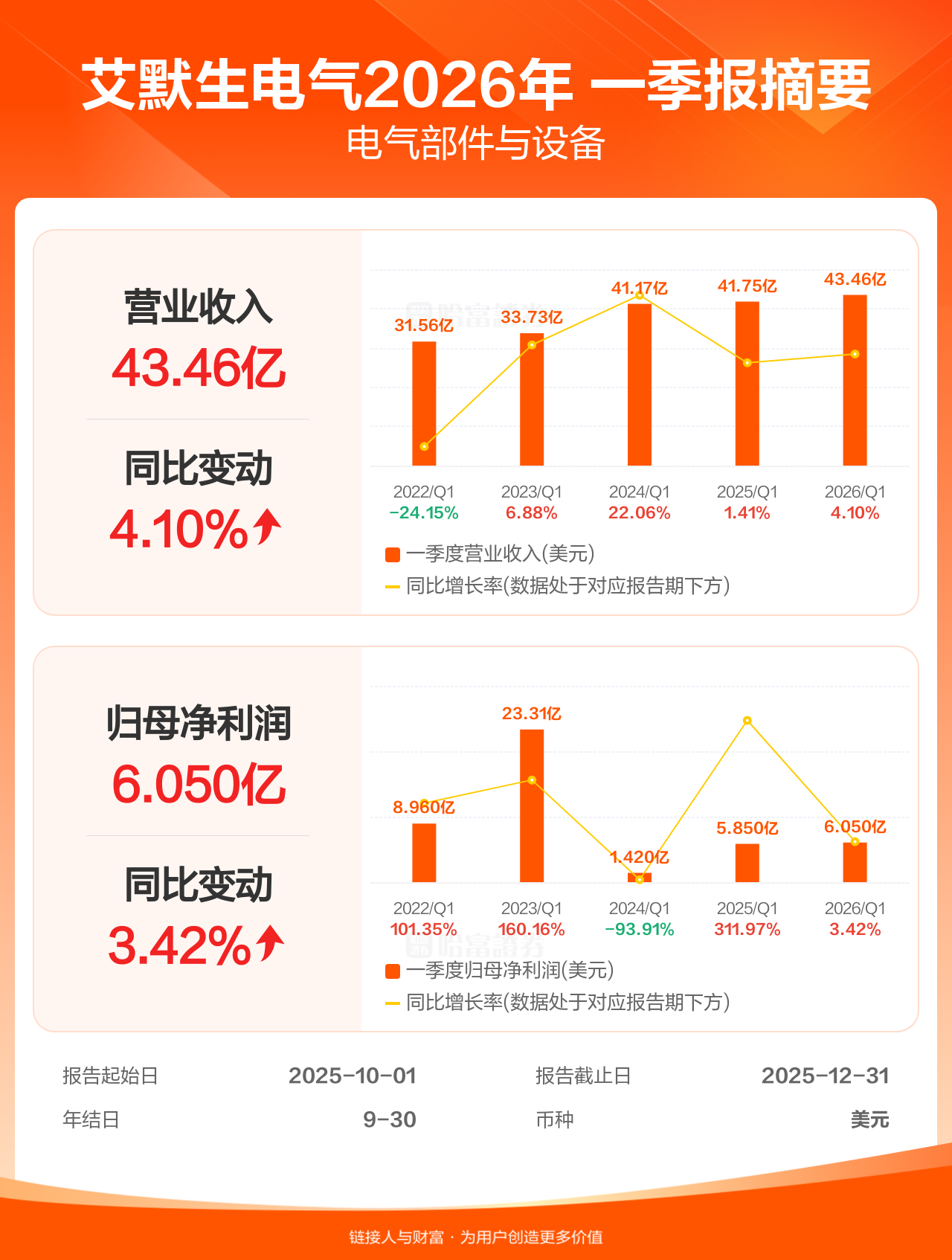 艾默生电气2月3日发布一季报业绩,截至2025年12月31日的3个月内,该公司营业收入43.46亿美元,同比增长4.10%;公司权益持有人应占溢利(归母净利润)6.05亿美元,同比增长3.42%。
