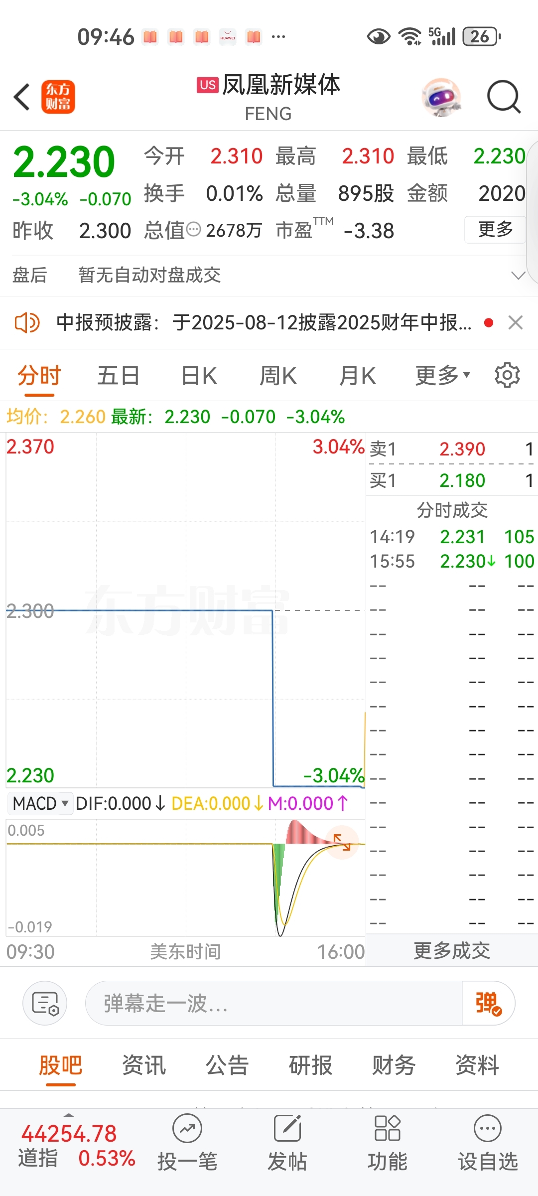 $凤凰新媒体(NYSE|FENG)$ 7月16日,分时成交205股,总量895股,金额2020元,这个上市公司很牛!