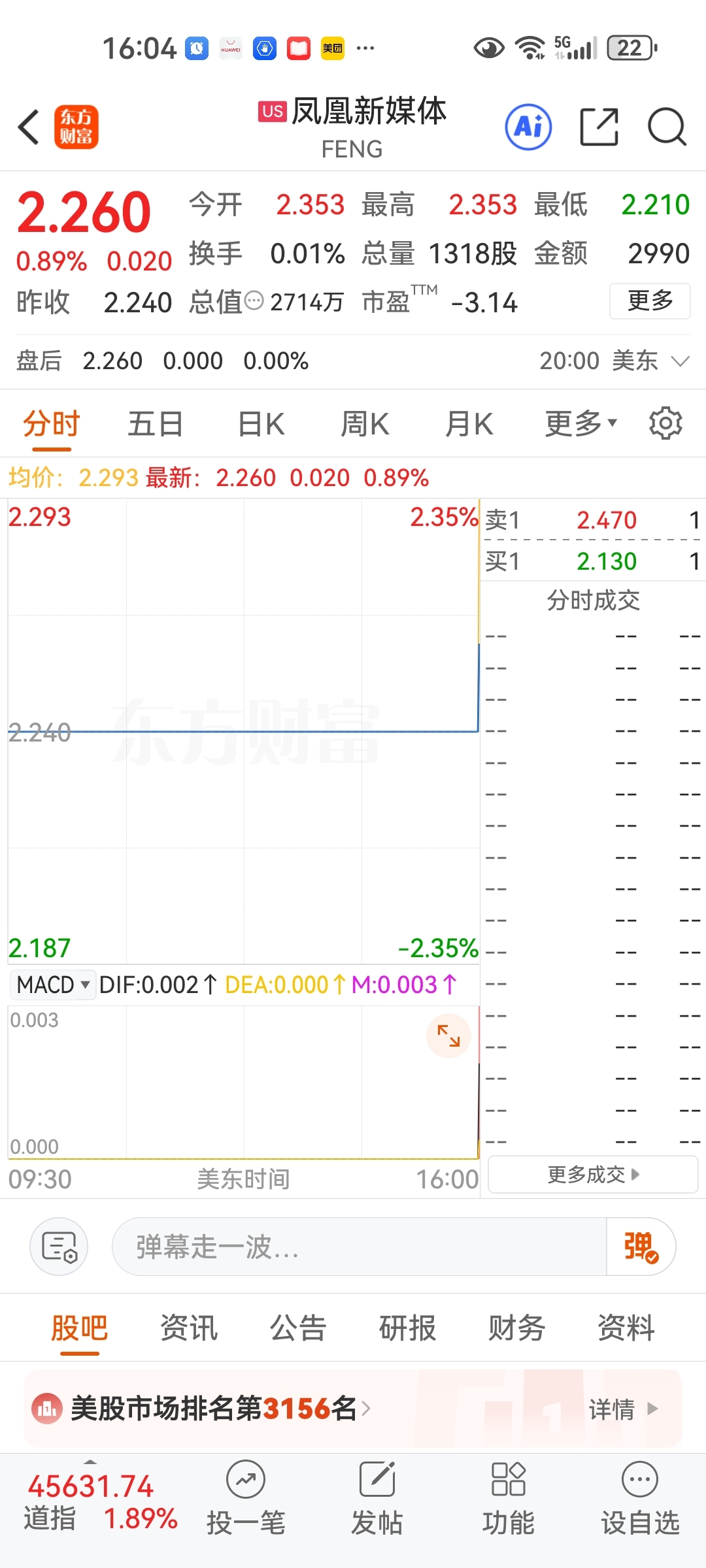 $凤凰新媒体(NYSE|FENG)$ 8月22日,分时成交为0!一股都没有。