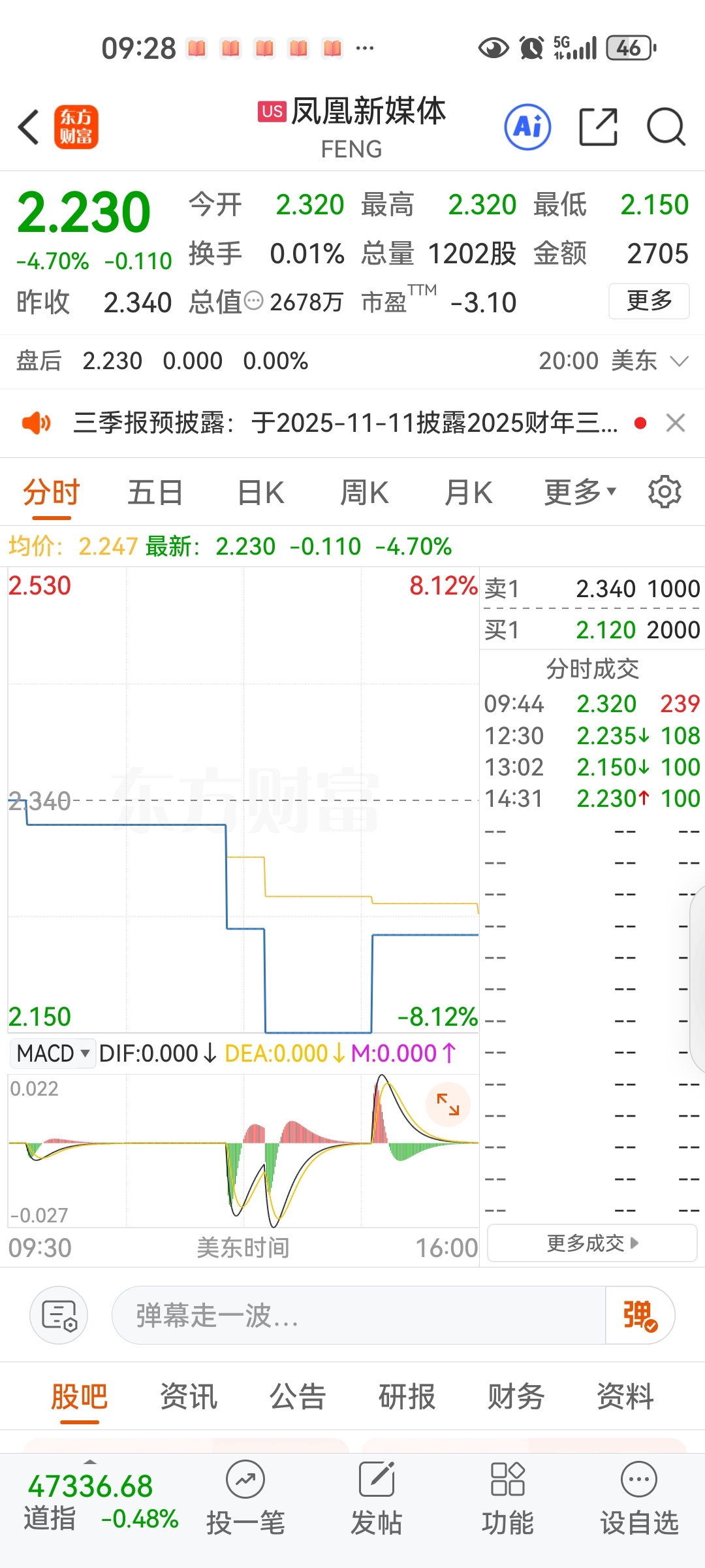 $凤凰新媒体(NYSE|FENG)$ 11月3日,成交仨瓜俩枣。