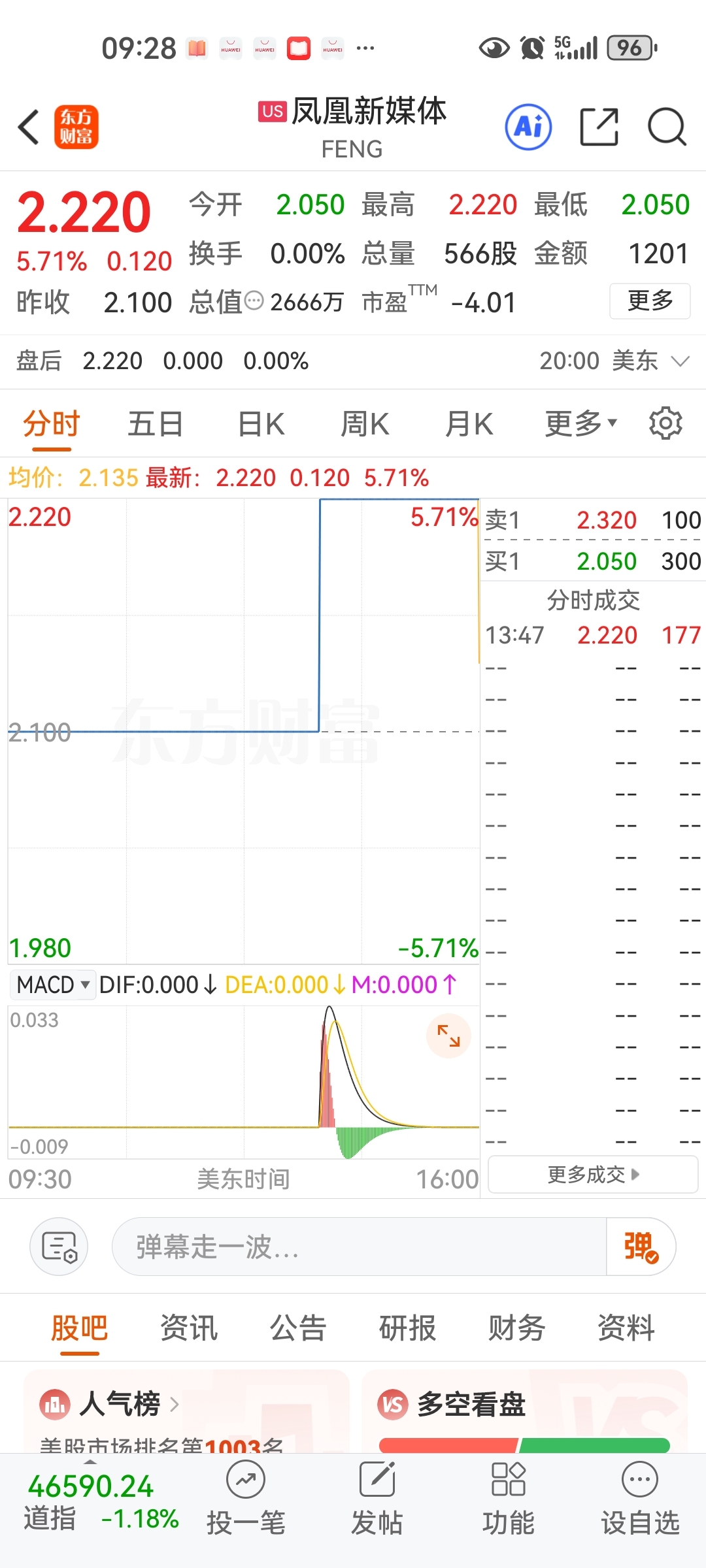 $凤凰新媒体(NYSE|FENG)$ 11月17日,分时成交177股,总量566股,金额1201元,卖白菜啦!