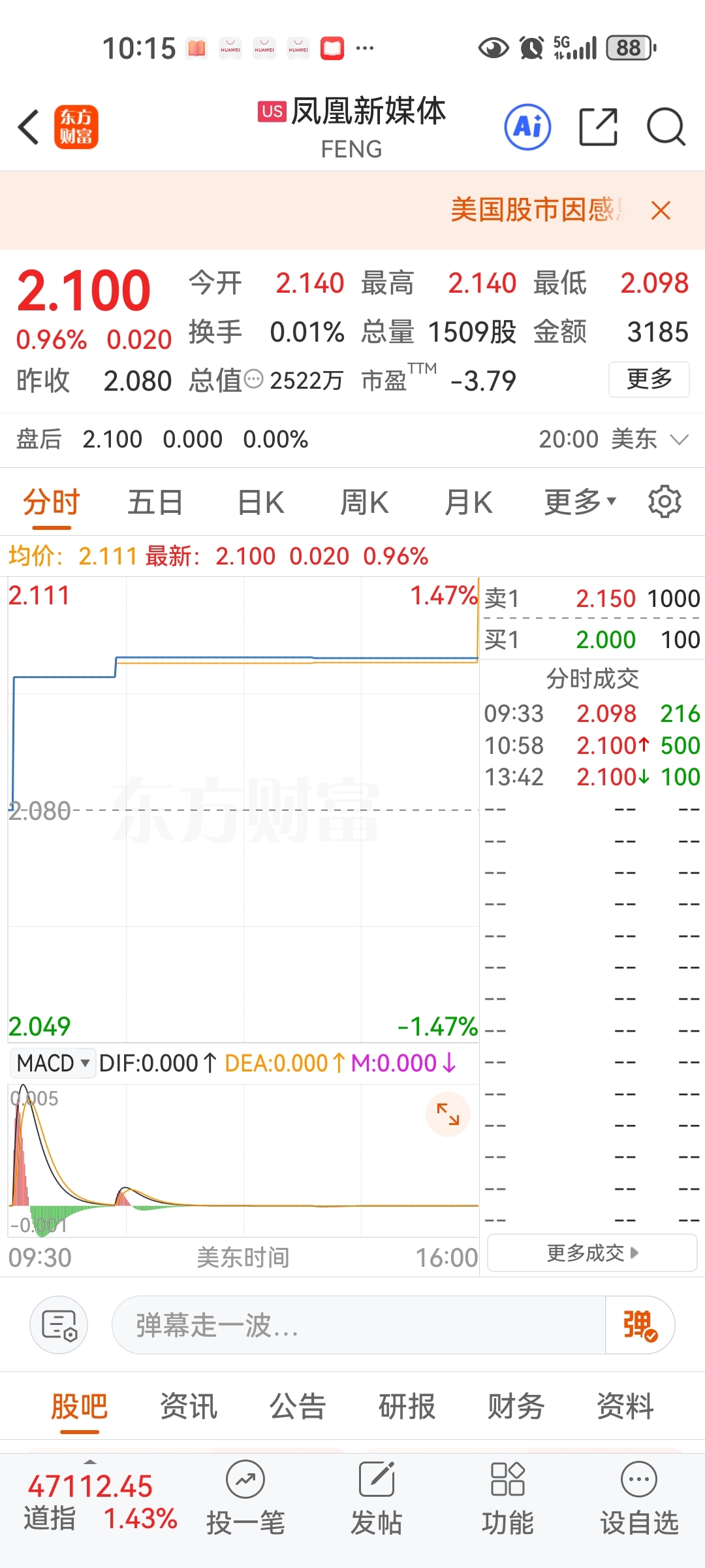 $凤凰新媒体(NYSE|FENG)$ 11月25日,成交仨瓜俩枣,一天总量1509股,3185元,太差劲了!!!