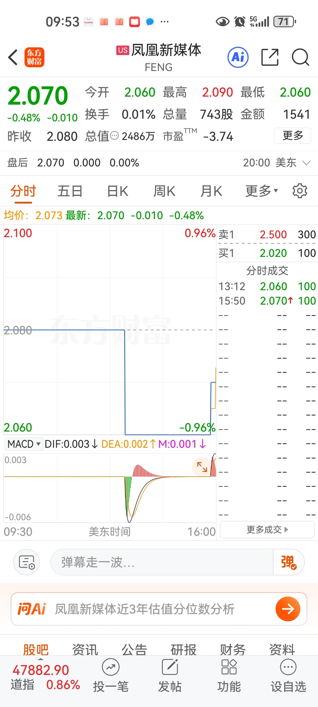 $凤凰新媒体(NYSE|FENG)$ 12月3日,一天分时成交200股,总量743股,金额1541元,拉机。