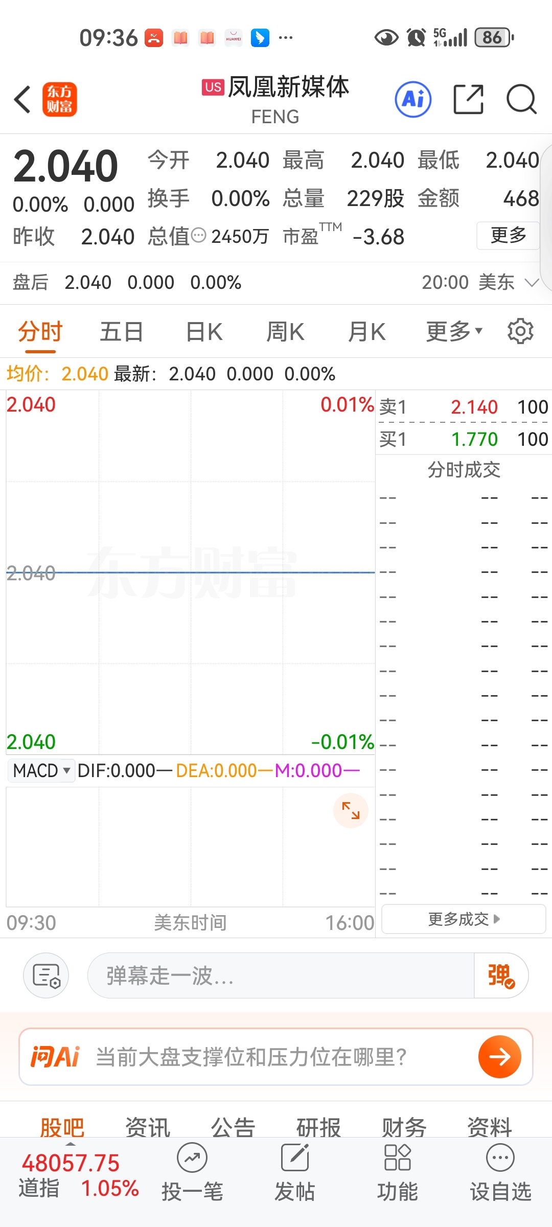 $凤凰新媒体(NYSE|FENG)$ 12月10日,分时成交为0!又是一个大鸭蛋!三天两头一个鸭蛋!