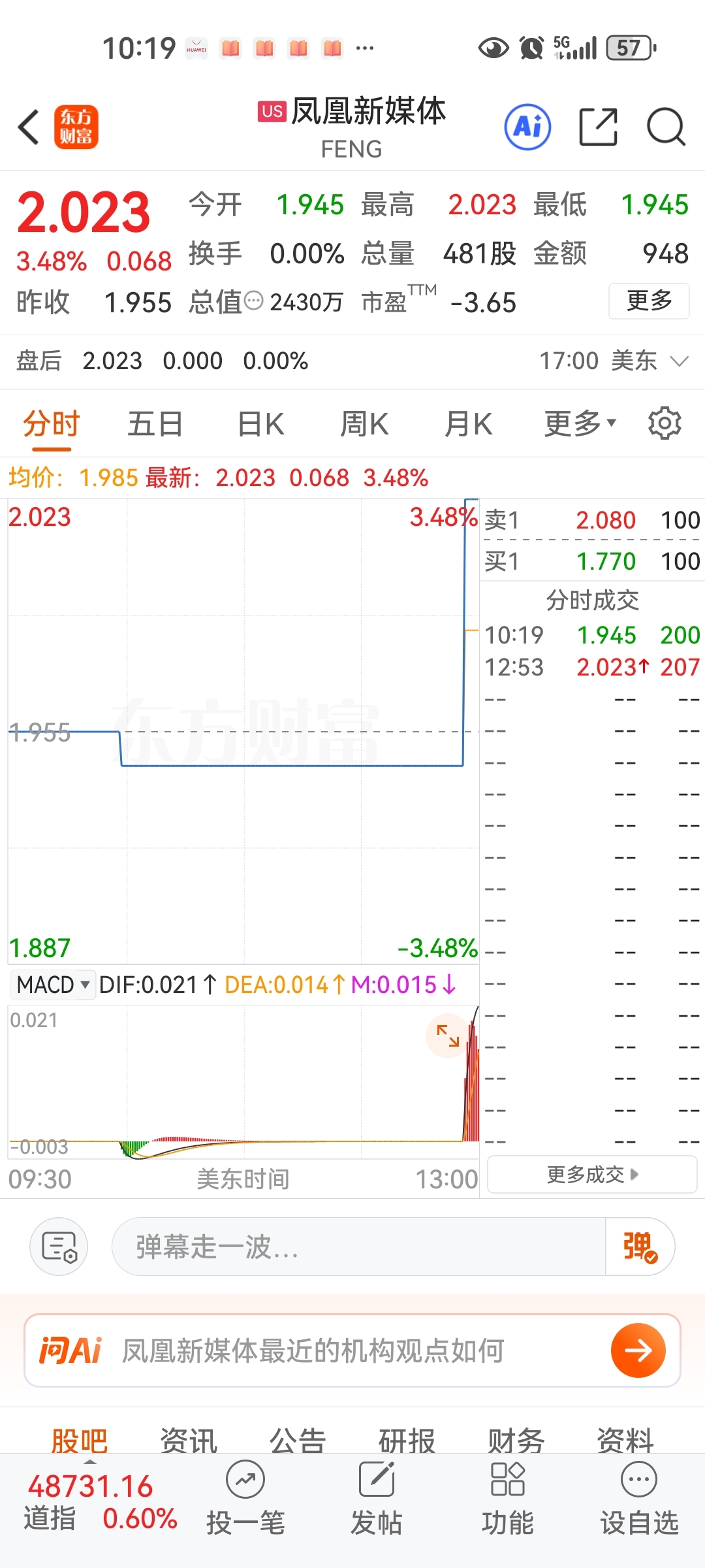 $凤凰新媒体(NYSE|FENG)$ 又是垃圾的一天,一天总量481股,948元!