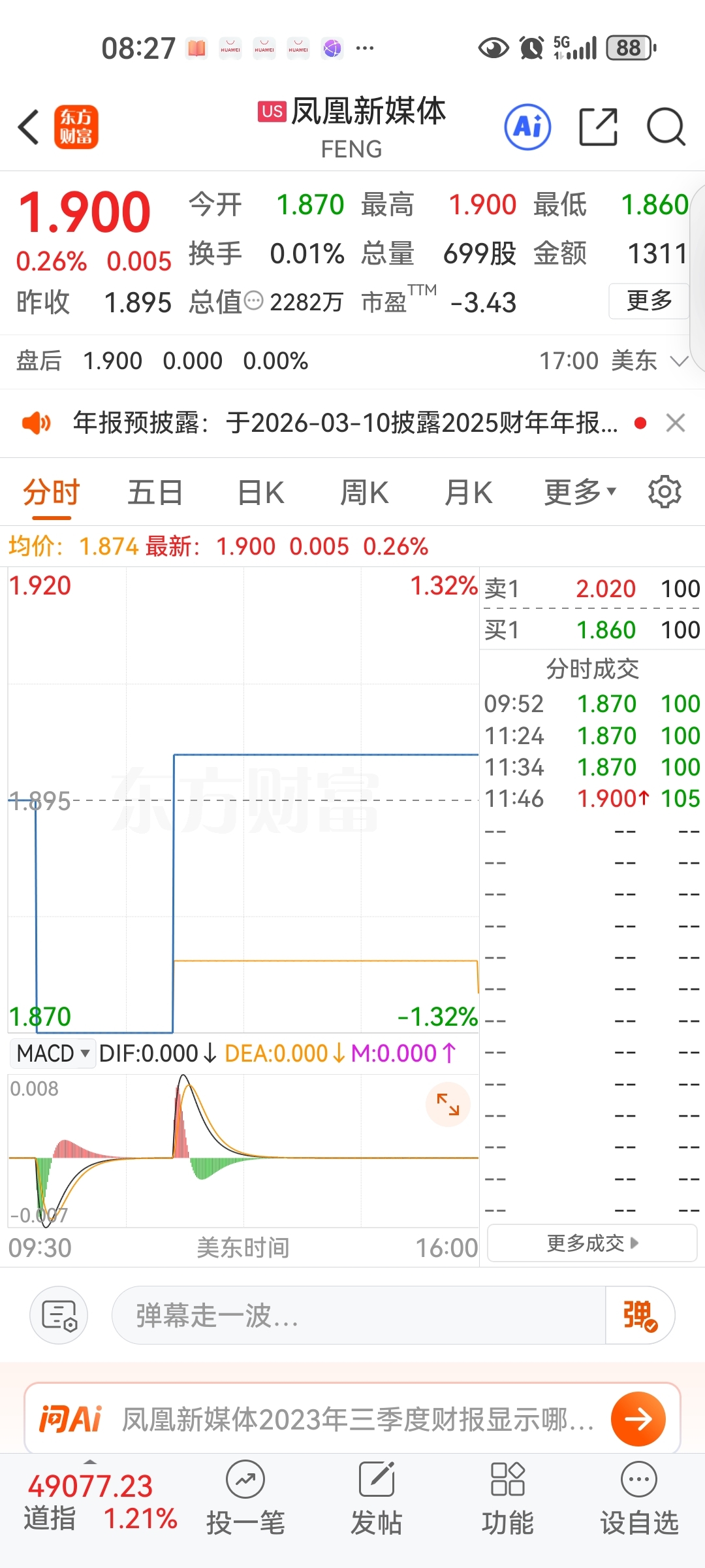 $凤凰新媒体(NYSE|FENG)$ 1月21日,一天只成交了几百股,天天没人买,天天没人买!好好反思自己!