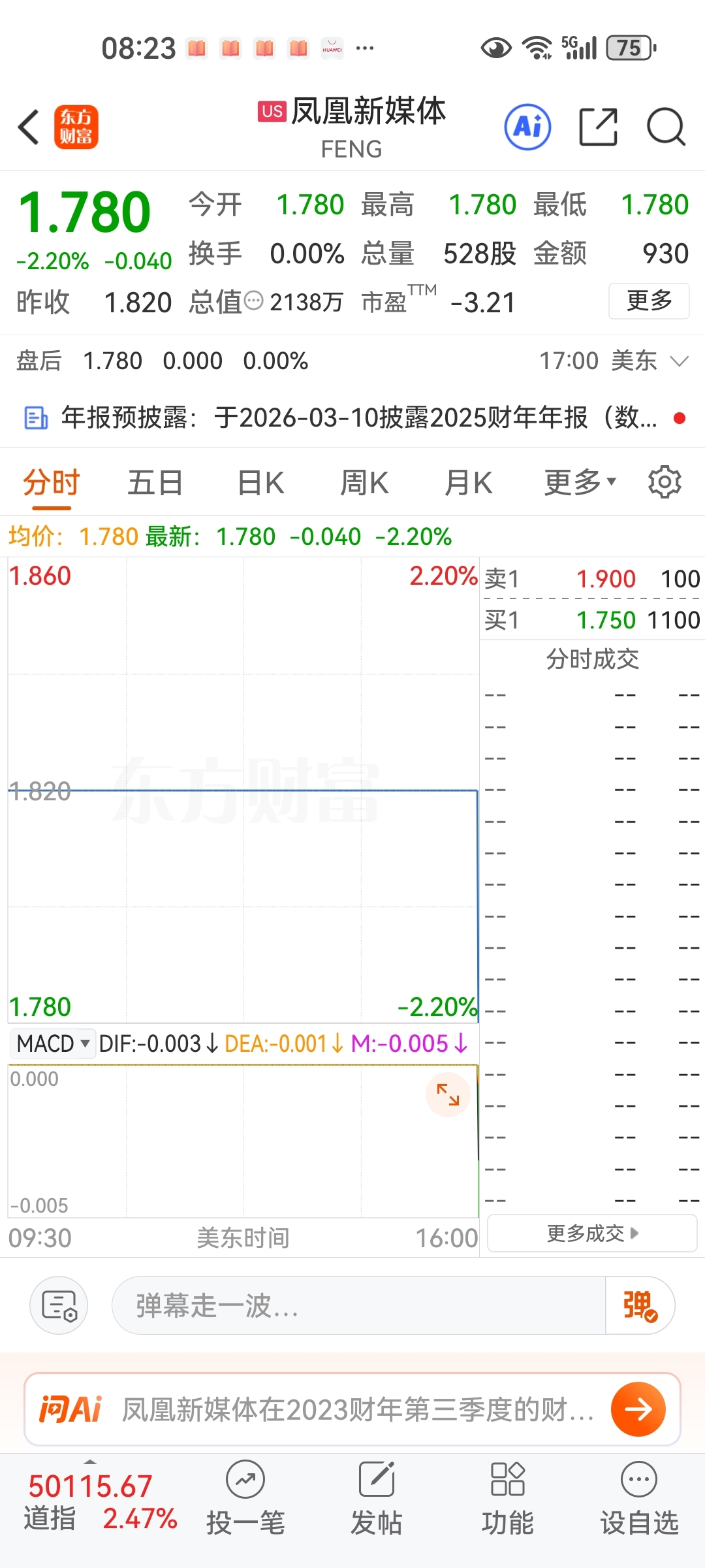 $凤凰新媒体(NYSE|FENG)$ 2月6日,分时成交为0!又是一个大鸭蛋!总量528股。