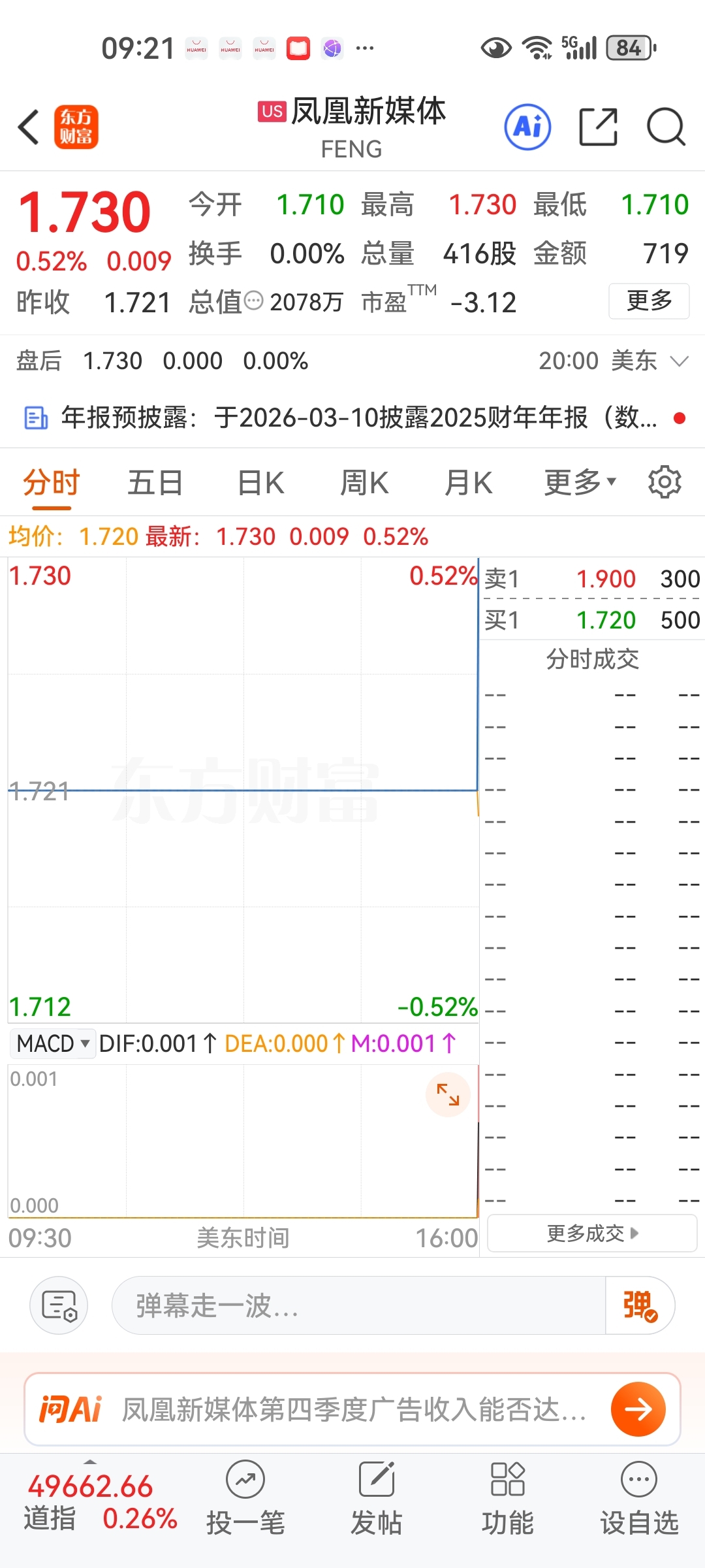 $凤凰新媒体(NYSE|FENG)$ 2月18日,分时成交为0!又是一个大鸭蛋!