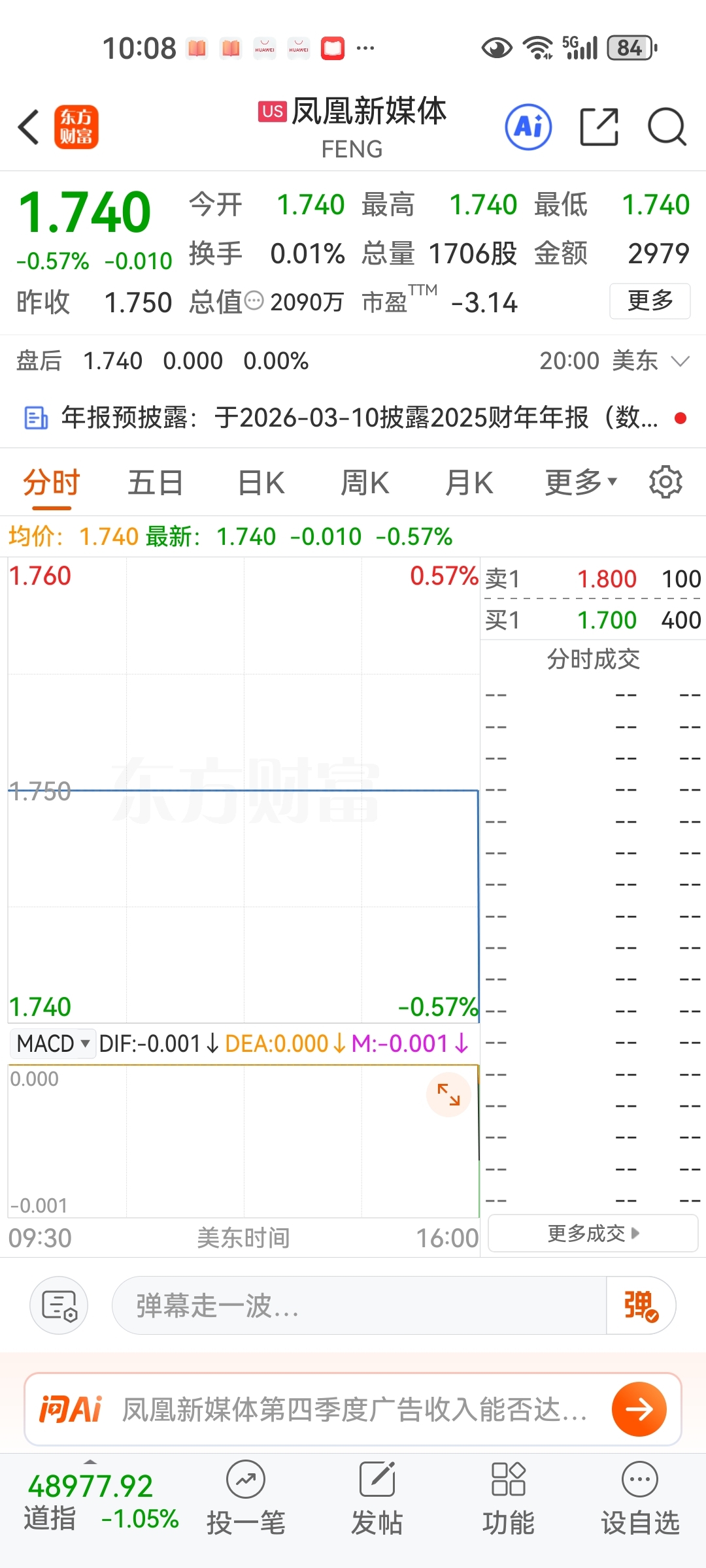 $凤凰新媒体(NYSE|FENG)$ 2月27日,分时成交为0!一个大鸭蛋!