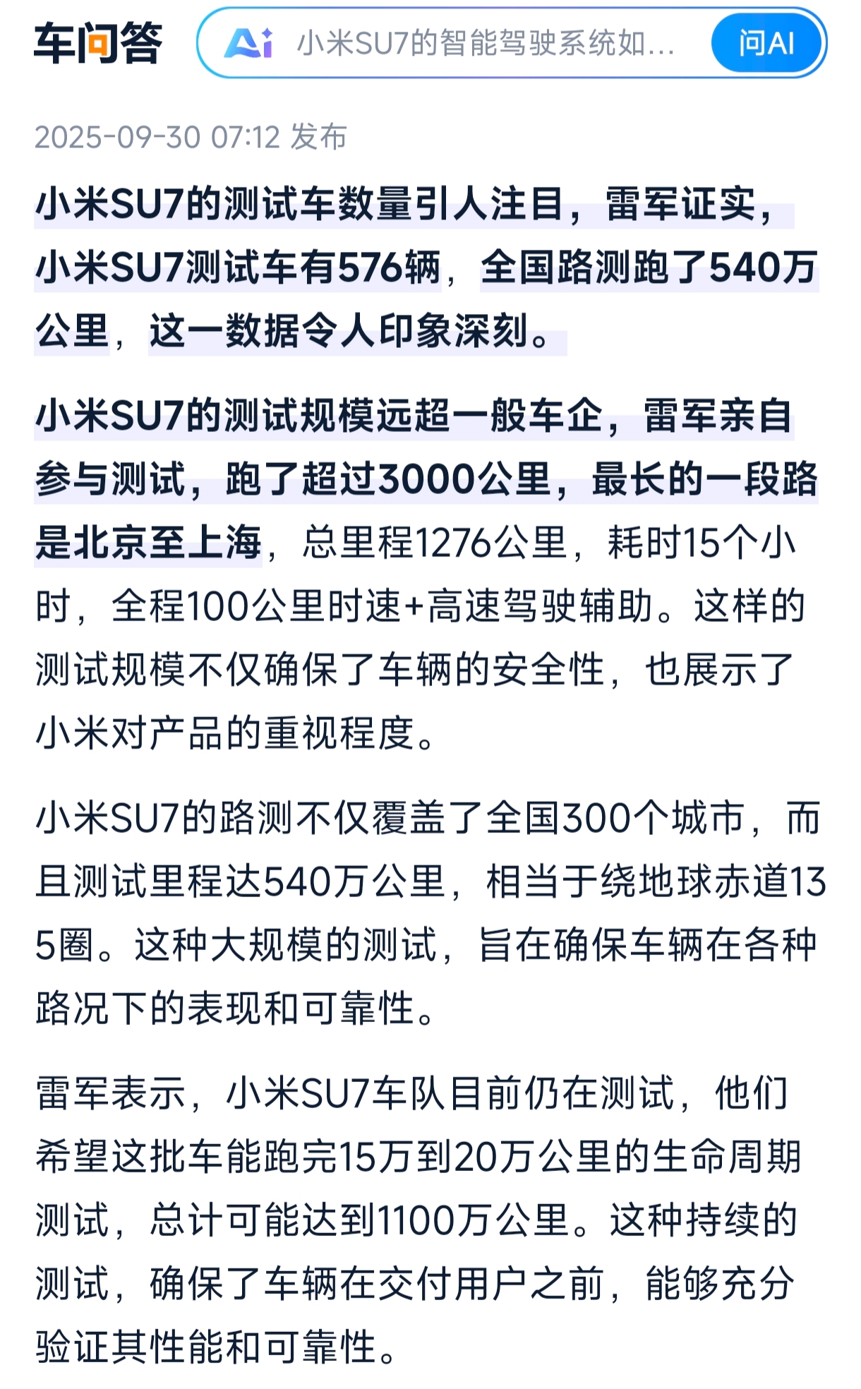 小米su7上市前路试车队车辆总数576辆,累计完成道路测试560万公里,请问@法