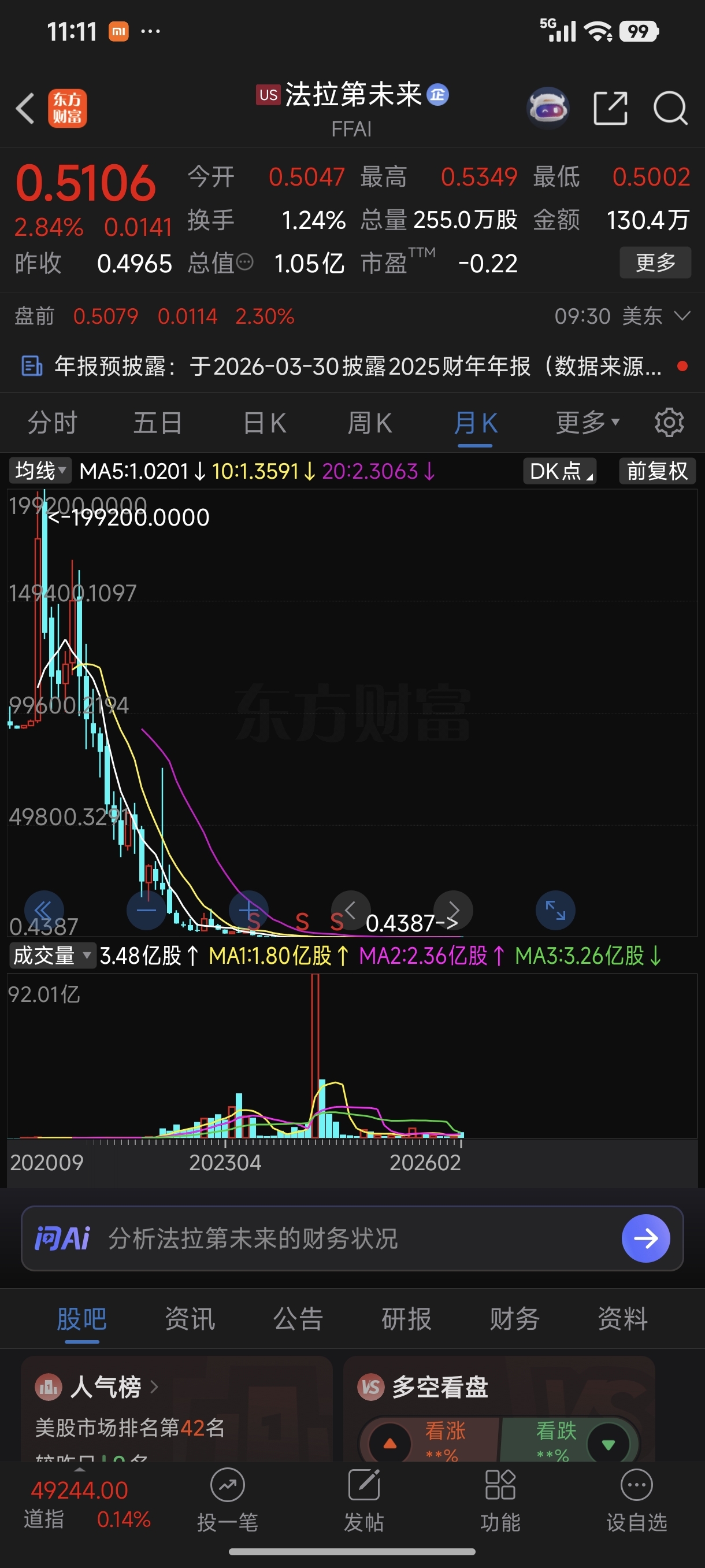 $法拉第未来(NASDAQ|FFAI)$ 19万跌到五毛,也是个牛股了。