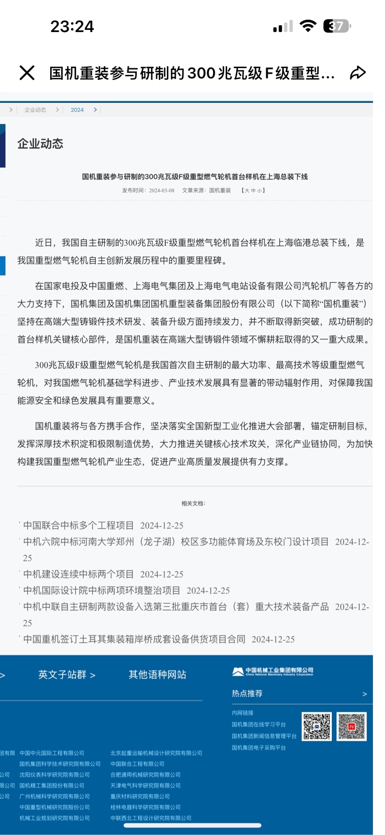 国机重装:300兆瓦级F级重型燃气轮机是我国首次自主研制的最大功率,最高技术等级重型燃气轮机。