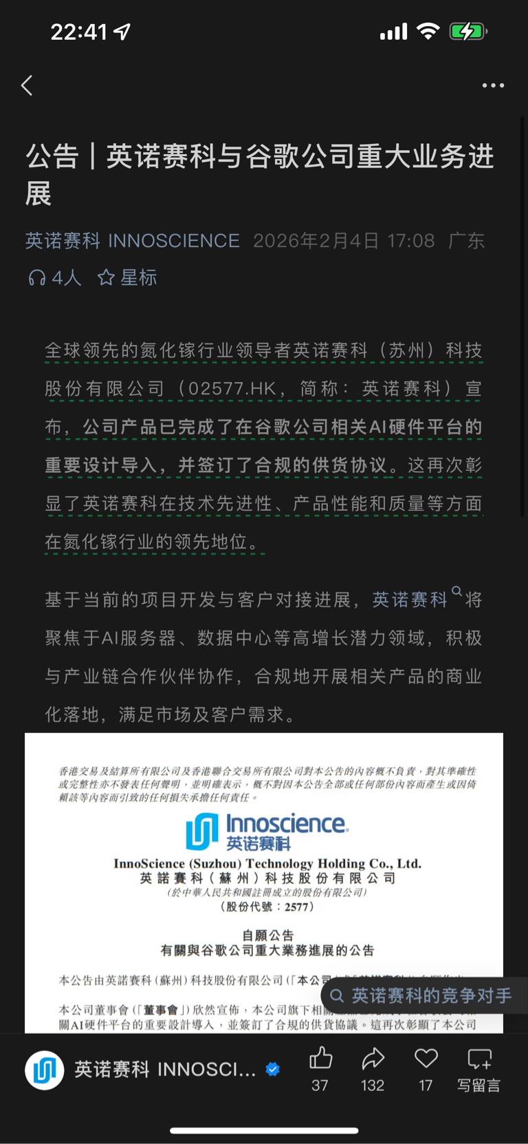$谷歌-A(NASDAQ|GOOGL)$ 英诺赛科发来贺电