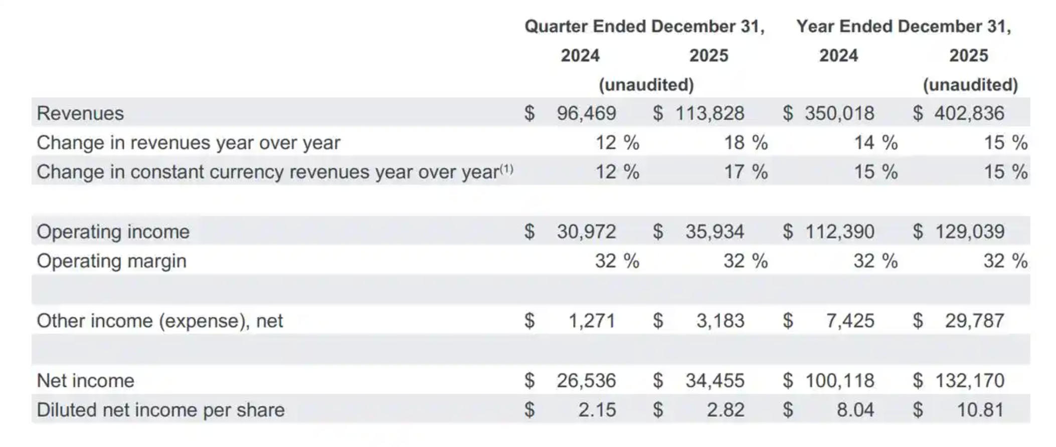 美东时间2月4日盘后,谷歌母公司Alphabet发布2025年财报,报告显示,公司第四季度实现营收1138.3亿美元,同比增长18%,净利润344.6亿美元,同比增长29.8%,高于市场预期。2025年全年,谷歌营收达4028.4亿美元,同比增长15%;净利润达到1321.7亿美元。这也是谷歌年营收首次突破4000亿美元大关。