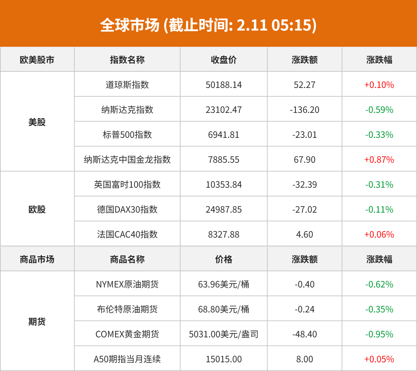 美股市场:美股三大指数02月10日收盘涨跌不一,道指续创历史新高。截至收盘,道琼斯工业平均指数比前一交易日上涨52.27点,收于50188.14点,涨幅为0.1%;标准普尔500种股票指数下跌23.01点,收于6941.81点,跌幅为0.33%;纳斯达克综合指数下跌136.2点,收于23102.47点,跌幅为0.59%。