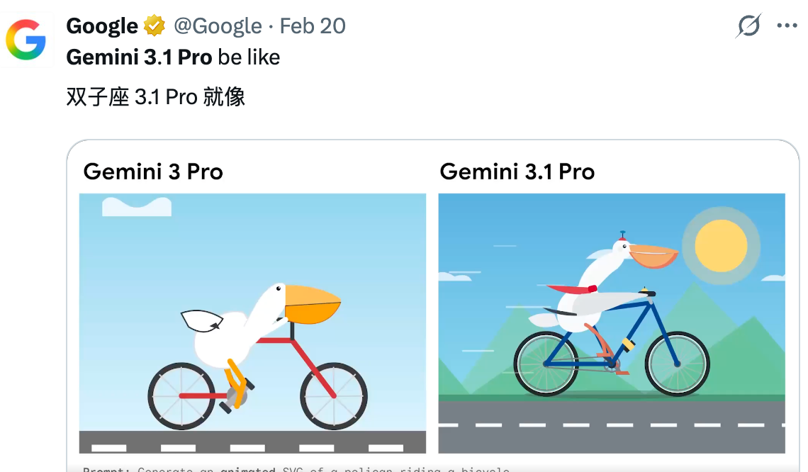 相比去年11月发布的 Gemini 3 Pro,这次版本号只增加了“0.1”,但从官方披露的测试结果来看,3.1Pro在多模态生成和深度推理上跃升了一大步。