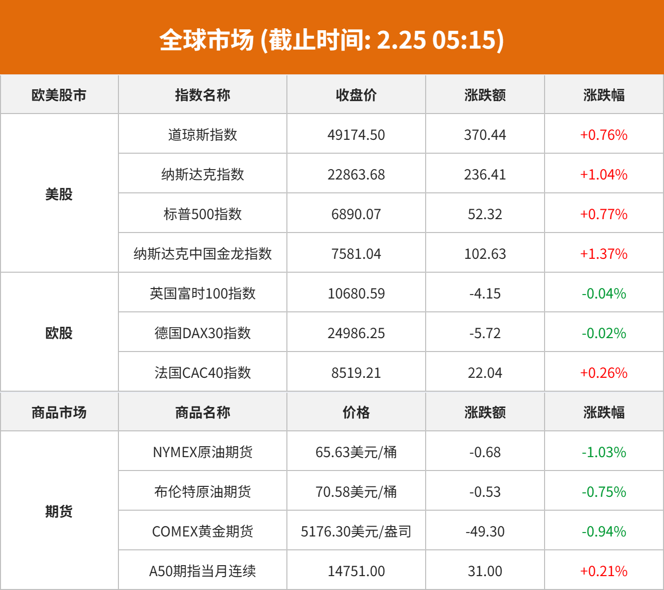 美股市场:美股三大指数02月24日收盘全线上涨。截至收盘,道琼斯工业平均指数比前一交易日上涨370.44点,收于49174.5点,涨幅为0.76%;标准普尔500种股票指数上涨52.32点,收于6890.07点,涨幅为0.77%;纳斯达克综合指数上涨236.41点,收于22863.68点,涨幅为1.04%。