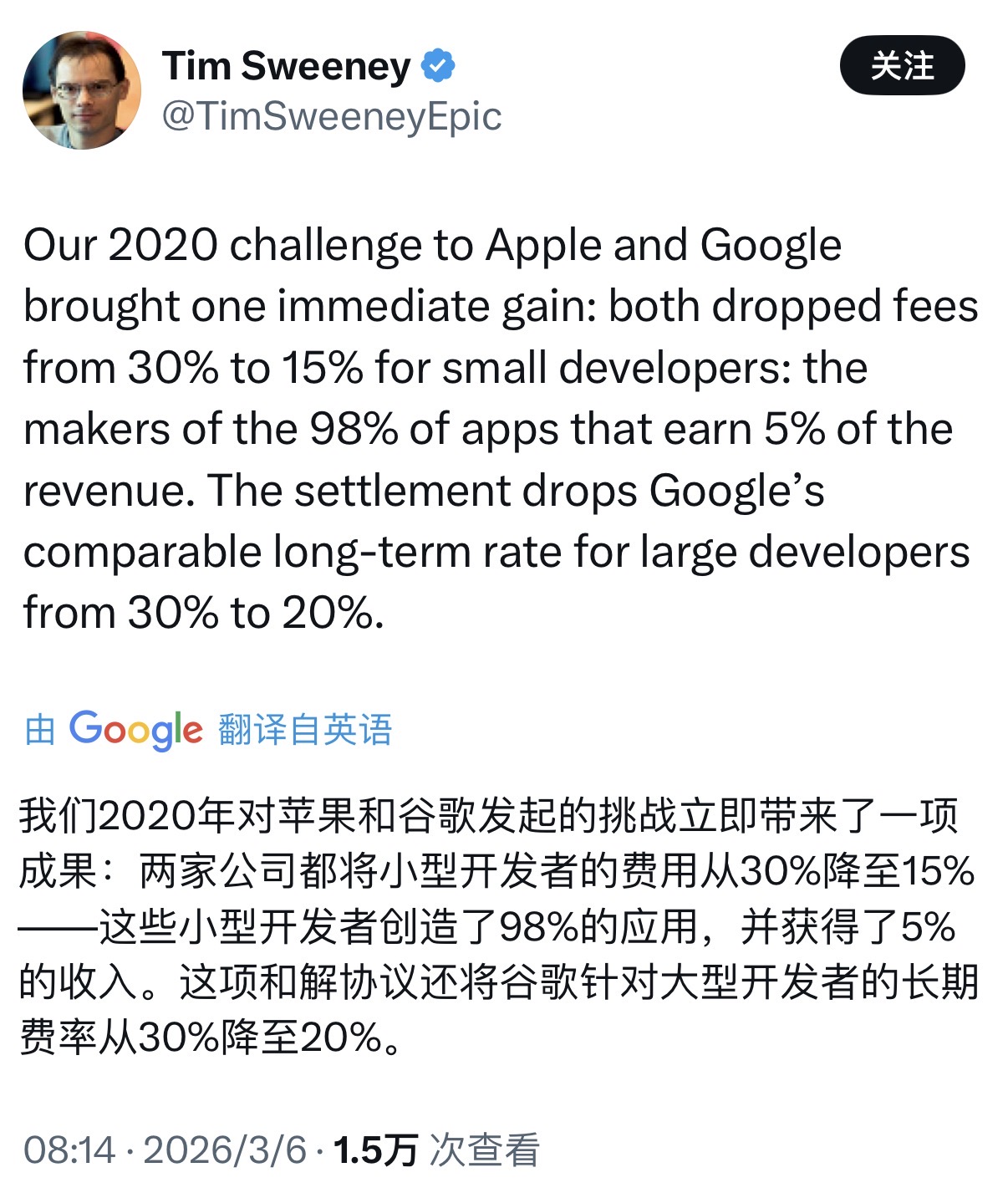 斯威尼还提到,2020年对苹果和谷歌发起的挑战都带来了好的成果,两家公司都将小型开发者的费用降低至15%,而谷歌更是覆盖了大型开发者,降低至20%。