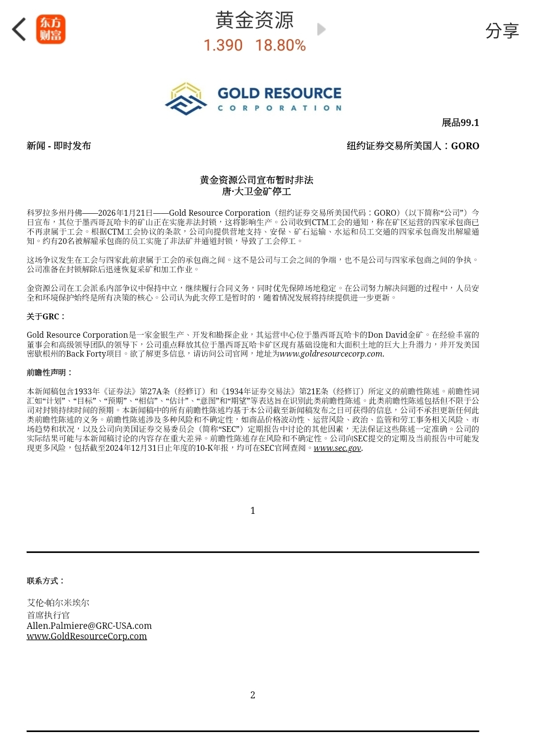 $黄金资源(AMEX|GORO)$ 有这消息怎么看?