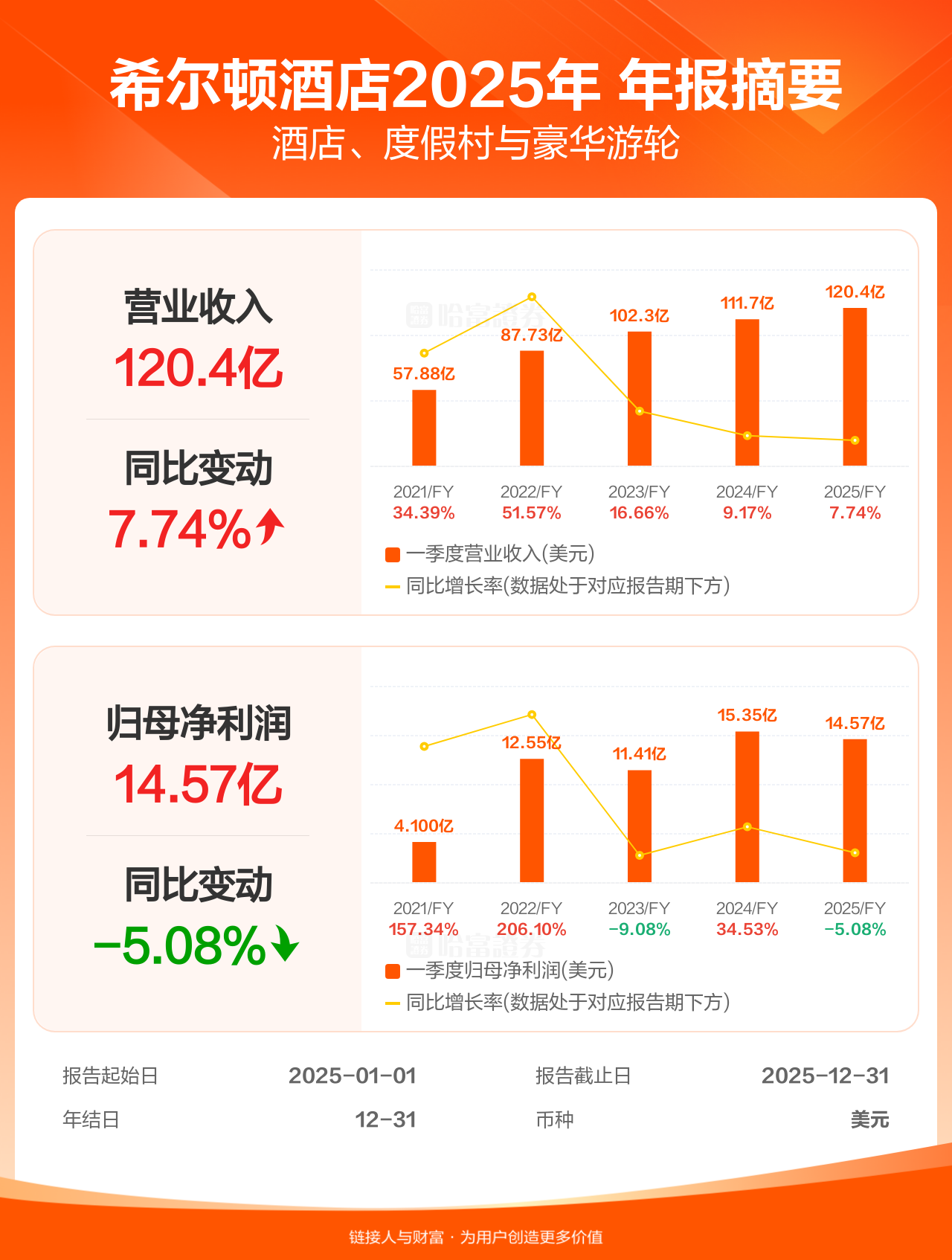 希尔顿酒店2月11日发布年报业绩,截至2025年12月31日的12个月内,该公司营业收入120.39亿美元,同比增长7.74%;公司权益持有人应占溢利(归母净利润)14.57亿美元,同比减少5.08%。