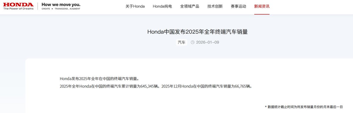 #数据 本田2025年全年在中国的终端汽车累计销量为645345辆(同比下滑24.3%)
