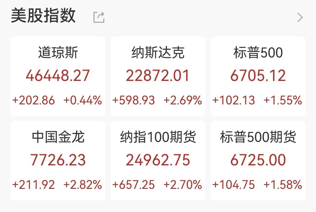 当地时间11月24日,美国三大股指全线收涨,道指涨0.44%,标普500指数涨1.55%,纳指涨2.69%。
