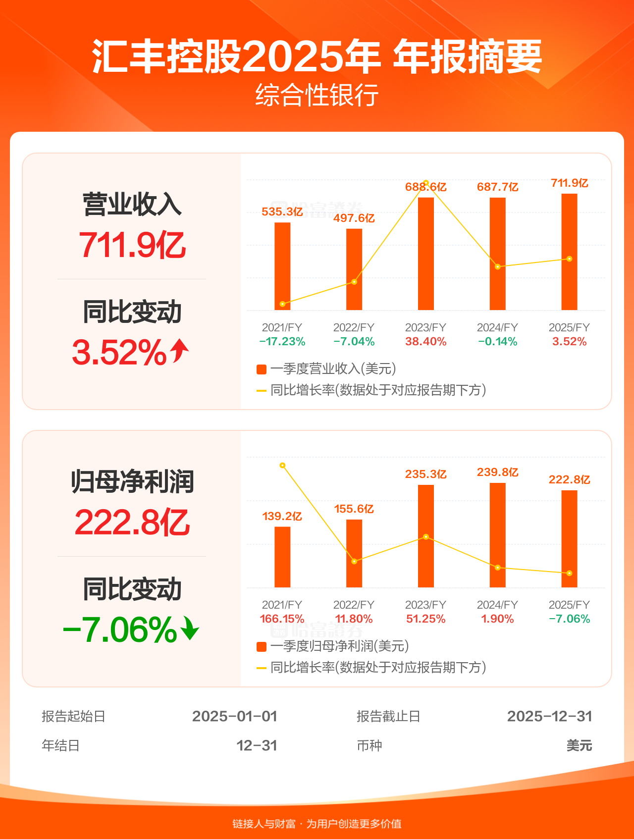 汇丰控股2月25日发布年报业绩,截至2025年12月31日的12个月内,该公司营业收入711.85亿美元,同比增长3.52%;公司权益持有人应占溢利(归母净利润)222.85亿美元,同比减少7.06%。