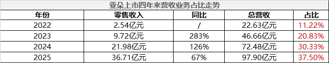 据界面新闻梳理,自上市以来,亚朵零售业务收入快速跃升,由2022年的2.54亿元增至2025年的36.7亿元。在总营收中的占比亦由11.22%提升至37.5%。