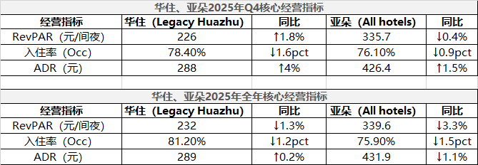 华住、亚朵2025年Q4及全年核心经营指标,Legacy Huazhu指华住(中国)。数据整理及制图:陈怡轩