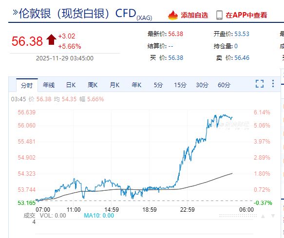 现货白银报56.38美元/盎司,日内上涨5.66%,创历史新高。