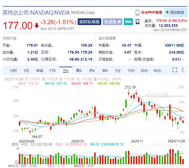 英伟达报177美元,跌1.81%,市值蒸发792亿美元(约合人民币5604亿元)。